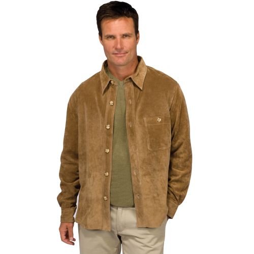 This is the genuine suede shirt that withstands machine washing because it undergoes a special treatment that pre-shrinks and protects the leather. Unlike lesser shirts, ours is made from supple two-ounce pig suede that emerges from the dryer soft and pliant instead of stiff and uncomfortable. Long enough to be worn as a jacket, the shirt resists wrinkling, allowing you to pack it flat for travel. It has fabric-lined sleeves, a six-button front, cotton stitching, and a front chest pocket. May also be dry cleaned. Tan. Men's sizes S (38-40"), M (40-42"), L (44-46"), XL (48-50"), and XXL (52"). Imported. (1 1/2 lbs.)